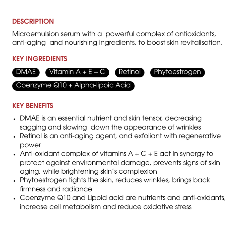 Microemulsion serum with a powerful complex of antioxidants, anti-aging and nourishing ingredients, to boost skin revitalization