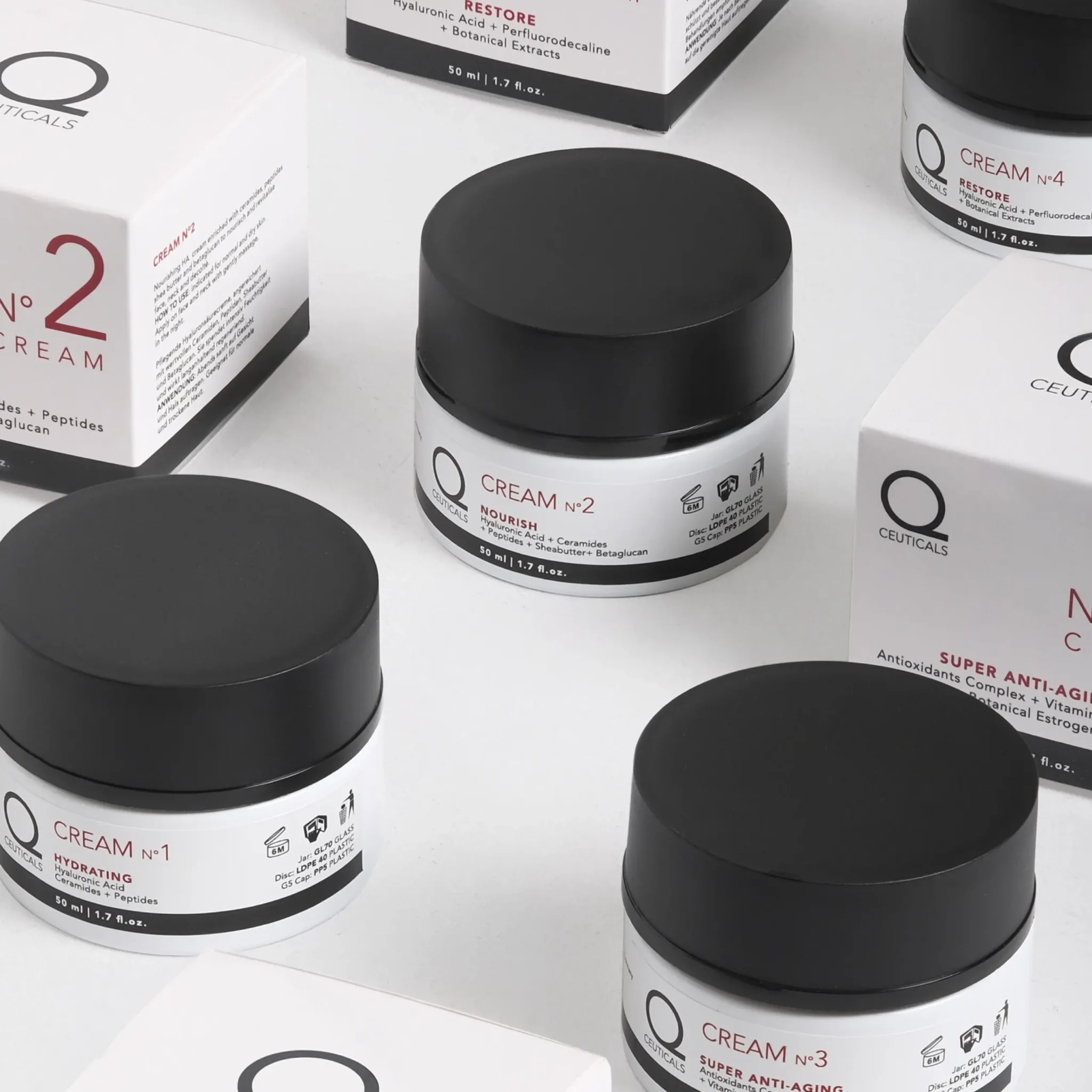 Qceuticals are based on natural and body identical active ingredients, in high concentration, such as hyaluronic acid, peptides, antioxidants vitamins and phytohormones.